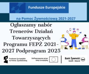 W ramach Programu Fundusze Europejskie na Pomoc Żywnościową 2021-2027 Podprogram 2025 Stowarzyszenie Bank Żywności Suwałki – Białystok, ul. Kowieńska 3/18, 16-400 Suwałki, poszukuje trenerów do przeprowadzenia następujących działań: